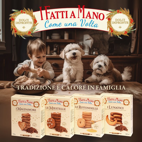 Biscotti in pasta frolla in scatola decorati con piccole stelle: ogni biscotto è realizzato ad uno ad uno, come una volta in famiglia. Peso netto 250gr. Alimento complementare per cani adulti