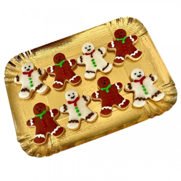 Vassoio sottovuoto contenente 8 biscotti decorati a forma di ginger, 6,5cm, finemente decorati a mano uno ad uno nel nostro laboratorio artigiano.